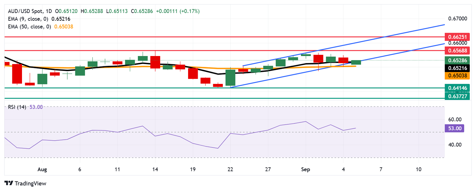 El AUD/USD se negocia alrededor de 0.6530 el viernes. El análisis técnico del gráfico diario muestra que el par está posicionado en el límite inferior del patrón de canal ascendente. Un movimiento adicional ofrecerá una clara tendencia direccional. El par está posicionado ligeramente por encima de la media móvil exponencial (EMA) de nueve días, lo que indica que el impulso del precio a corto plazo sigue siendo más fuerte.