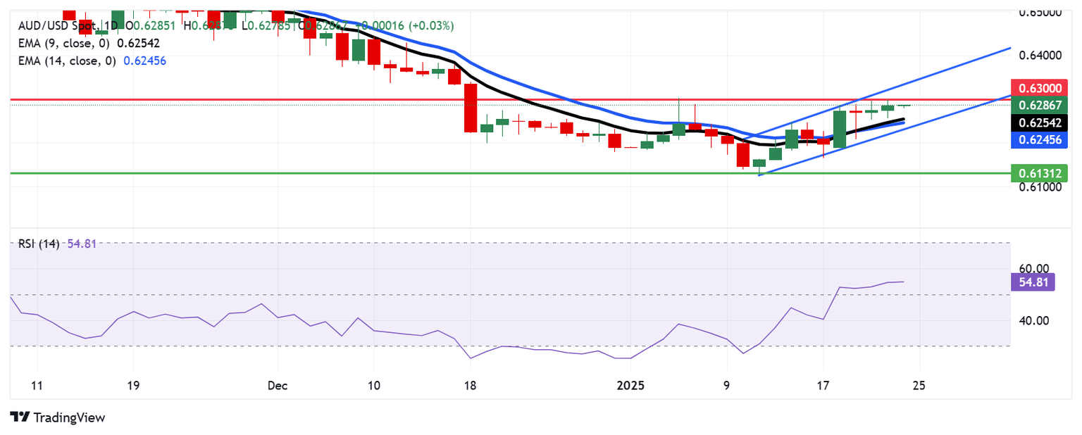 El par AUD/USD cotiza cerca de 0.6280 el viernes, con un análisis del gráfico diario que indica movimiento dentro de un patrón de canal ascendente, sugiriendo un posible sesgo alcista. Además, el Índice de Fuerza Relativa (RSI) de 14 días se mantiene por encima de 50, reforzando el sentimiento positivo del mercado.