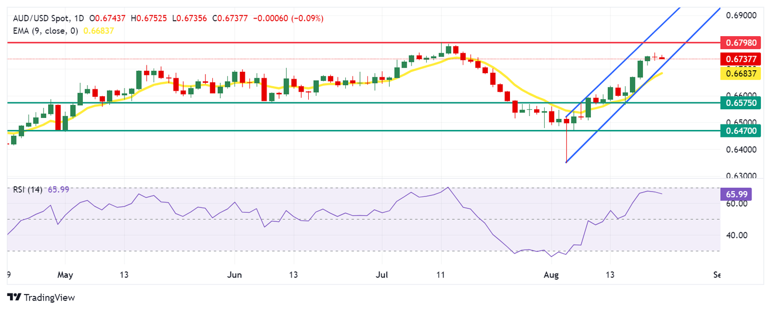 El Dólar australiano cotiza alrededor de 0.6740 el jueves. El análisis del gráfico diario muestra que el par AUD/USD se consolida dentro de un canal ascendente, lo que sugiere un sesgo alcista. Además, el Índice de Fuerza Relativa (RSI) de 14 días se mantiene ligeramente por debajo de la marca de 70, apoyando el impulso alcista en curso. Un movimiento ascendente adicional podría indicar que el par de divisas está sobrecomprado, lo que podría llevar a una corrección.