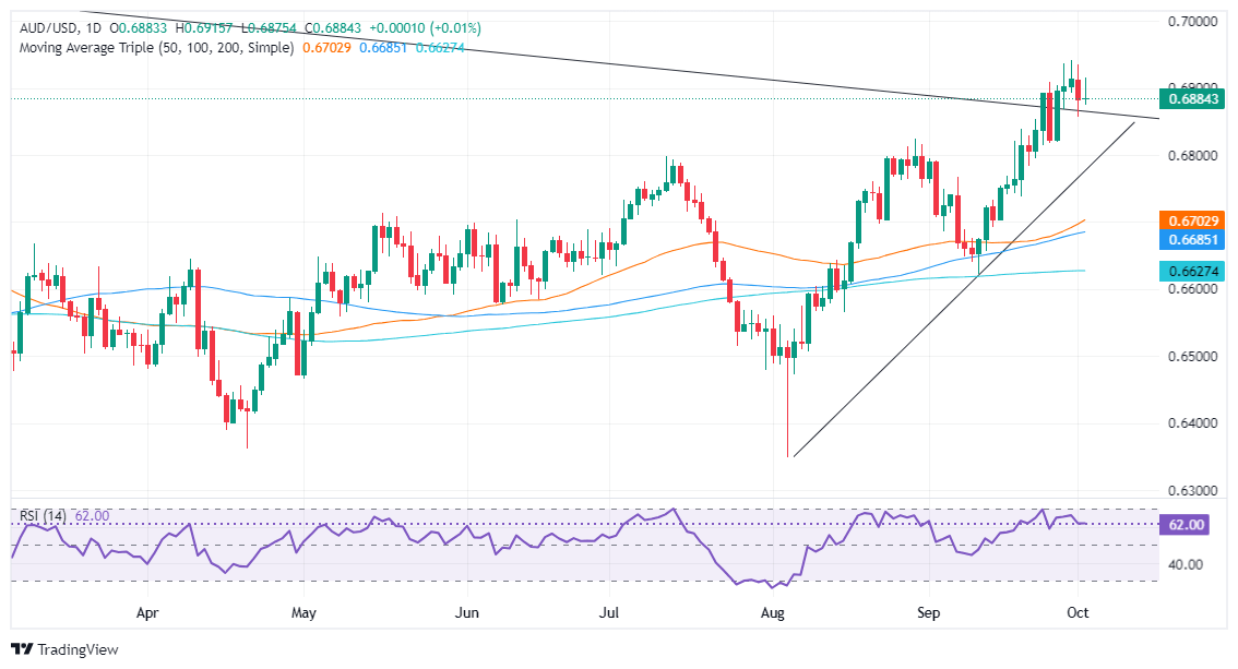 El AUD/USD está listo para extender sus pérdidas después de no poder mantener las ganancias por encima de la cifra de 0.6900. Aunque el impulso sugiere que los compradores están a cargo, el Índice de Fuerza Relativa (RSI) apunta a la baja a corto plazo. Por lo tanto, el AUD/USD está inclinado a la baja antes de reanudar su tendencia alcista en curso.