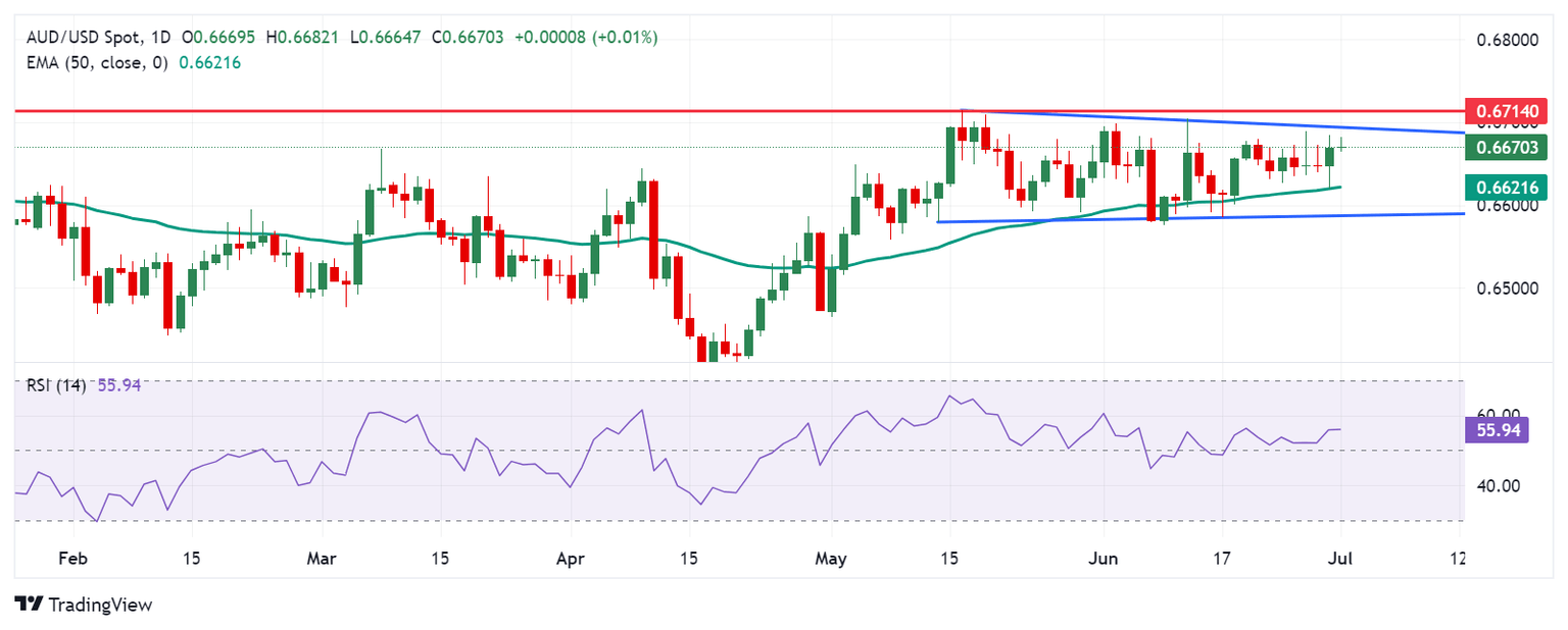 El Dólar australiano cotiza alrededor de 0.6670 el lunes. El análisis del gráfico diario indica un sesgo neutral para el par AUD/USD mientras se consolida dentro de una formación rectangular. El Índice de Fuerza Relativa (RSI) de 14 días se posiciona ligeramente por encima del nivel 50, lo que sugiere un potencial sesgo alcista.