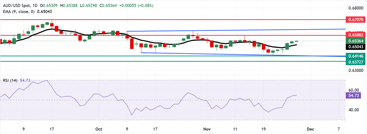 El par AUD/USD se cotiza alrededor de 0.6540 el viernes. El análisis técnico del gráfico diario muestra que el par se está negociando dentro de una zona de consolidación rectangular, reflejando un sesgo neutral. El par se ha movido por encima de la media móvil exponencial (EMA) de nueve días, indicando un fortalecimiento del impulso alcista a corto plazo.