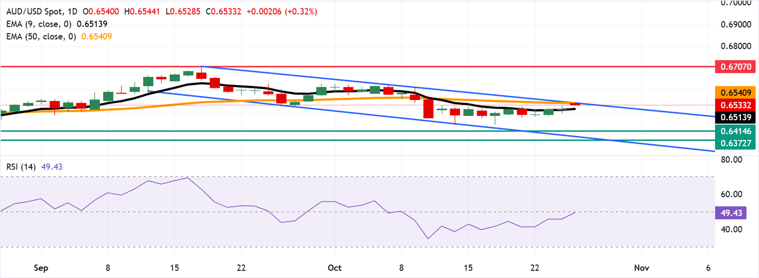 El AUD/USD se cotiza alrededor de 0.6530 el lunes. Un análisis técnico de un gráfico diario sugiere un potencial debilitamiento de un sesgo bajista, con el par posicionado cerca del límite superior del canal descendente. El par se cotiza por encima de la media móvil exponencial (EMA) de nueve días, lo que sugiere que el impulso de precios a corto plazo es más fuerte.
