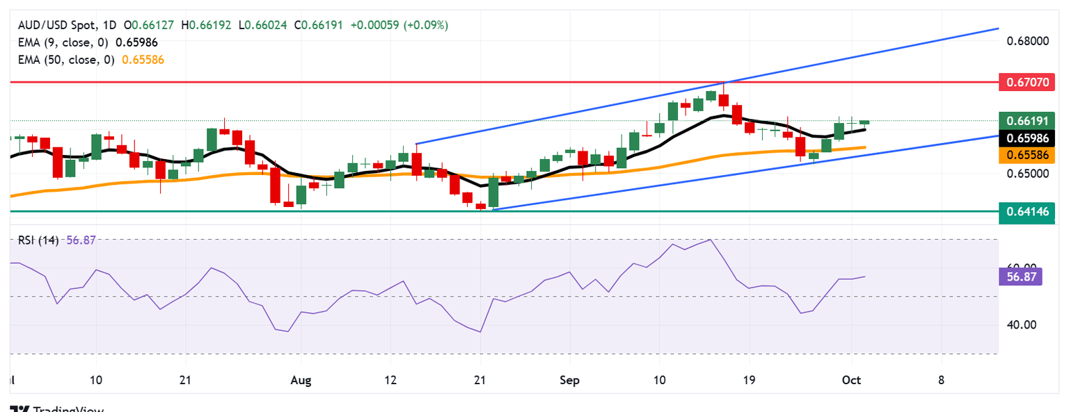 El par AUD/USD se negocia alrededor de 0.6620 el jueves. El análisis técnico en el gráfico diario muestra que el par se mantiene dentro del canal ascendente, indicando un sesgo alcista predominante. Además, el Índice de Fuerza Relativa (RSI) de 14 días está posicionado por encima del nivel 50, fortaleciendo el sesgo alcista.