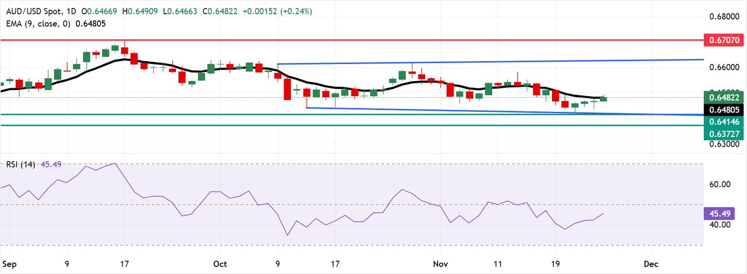 El par AUD/USD se cotiza alrededor de 0.6480 el miércoles. El análisis del gráfico diario muestra que el par se mantiene dentro de una zona de consolidación rectangular, señalando un sesgo neutral. El par continúa cotizando por debajo de la Media Móvil Exponencial (EMA) de nueve días, destacando un impulso a corto plazo contenido.