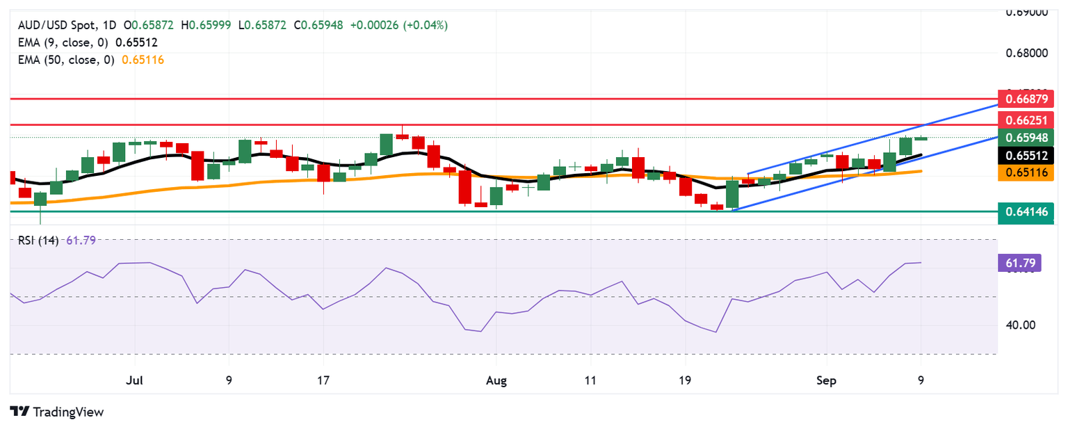 El par AUD/USD se cotiza alrededor de 0.6590 el martes. El análisis técnico del gráfico diario muestra que el par se mueve hacia arriba dentro del patrón de canal ascendente, sugiriendo el fortalecimiento de un sesgo alcista. Además, el par está posicionado por encima de la media móvil exponencial (EMA) de nueve días, lo que indica que el impulso de precios a corto plazo es más fuerte.