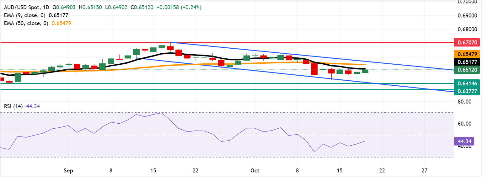 El AUD/USD se está negociando alrededor de 0.6510 el lunes. Un análisis técnico de un gráfico diario indica un sesgo bajista sostenido, con el par negociándose dentro de un canal descendente. El RSI de 14 días se mantiene por debajo de 50, reforzando la perspectiva bajista.