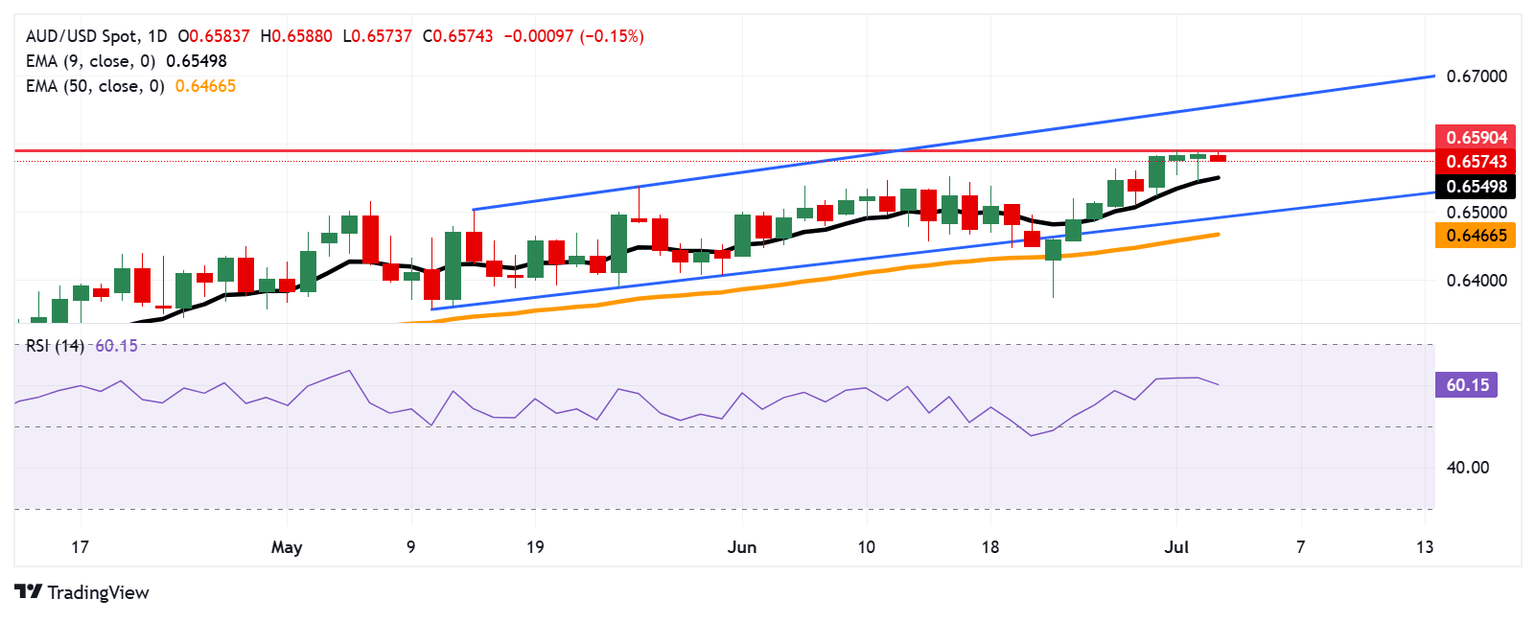El AUD/USD se está negociando alrededor de 0.6570 el jueves. El análisis técnico del gráfico diario indica un sesgo alcista persistente a medida que el par se mueve hacia arriba dentro del patrón de canal ascendente. El Índice de Fuerza Relativa (RSI) de 14 días se posiciona por encima del nivel 50, reforzando el sentimiento alcista. Además, el par se mantiene por encima de la media móvil exponencial (EMA) de nueve días, sugiriendo que el impulso de precios a corto plazo es más fuerte.