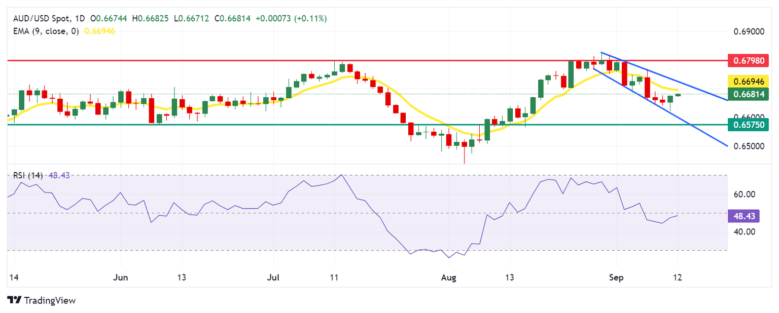 El par AUD/USD cotiza cerca de 0.6680 el jueves, con un análisis técnico del gráfico diario que indica que se mantiene dentro de un canal descendente, señalando un sesgo bajista. El Índice de Fuerza Relativa (RSI) de 14 días se mantiene por debajo del nivel 50, confirmando la tendencia bajista en curso.