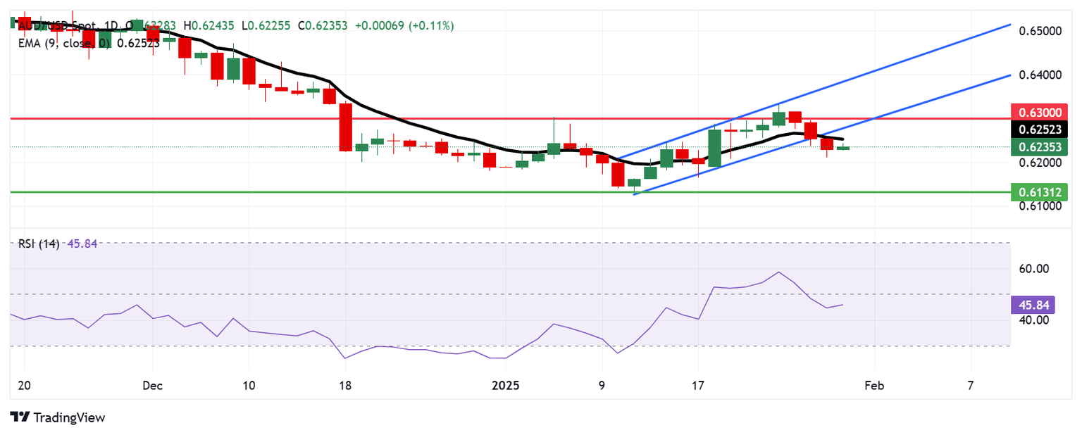 El par AUD/USD ronda los 0.6230 el jueves, negociándose justo por debajo del canal ascendente en el gráfico diario, lo que indica un cambio hacia un sesgo bajista. El Índice de Fuerza Relativa (RSI) de 14 días permanece por debajo de la marca de 50, confirmando aún más el impulso a la baja.