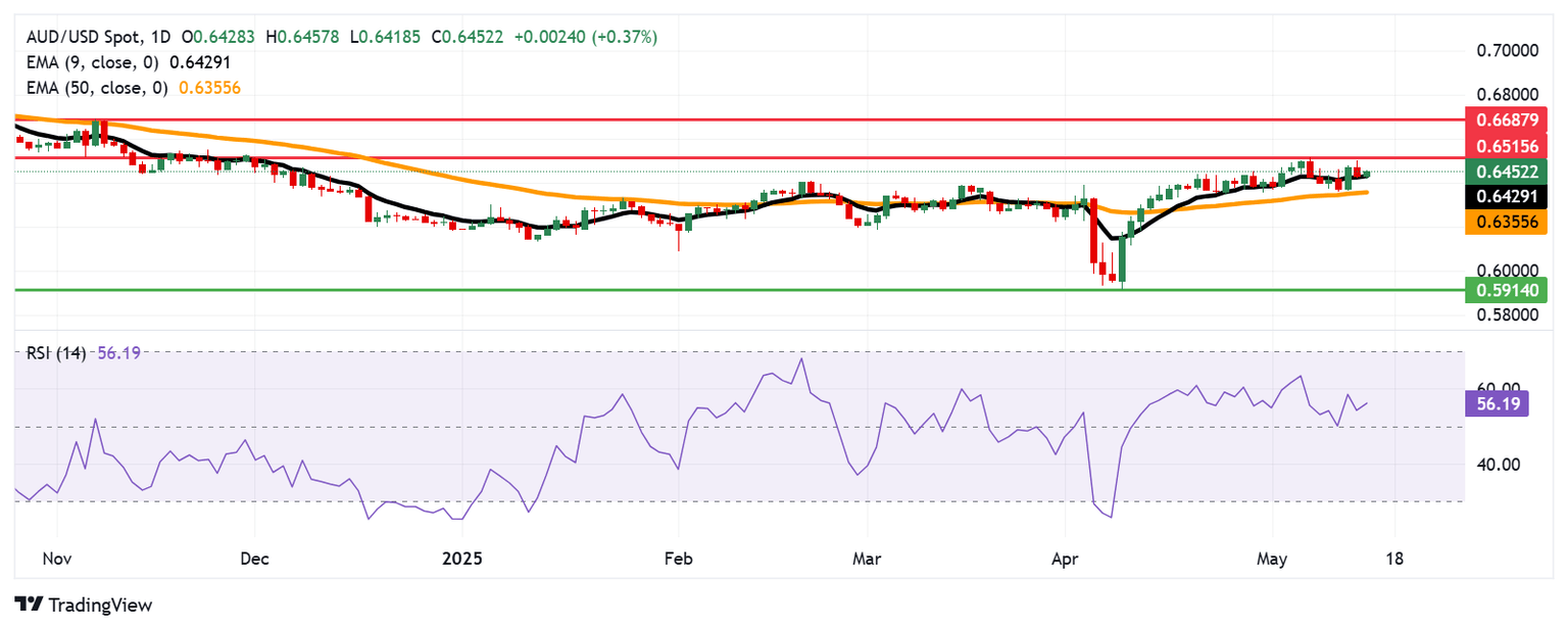 El AUD/USD se encuentra rondando 0.6430 el jueves. El análisis del gráfico diario sugiere un sesgo alcista, con el par manteniéndose por encima de la Media Móvil Exponencial (EMA) de nueve días. Además, el Índice de Fuerza Relativa (RSI) de 14 días se mantiene por encima del umbral de 50, apoyando el impulso positivo.