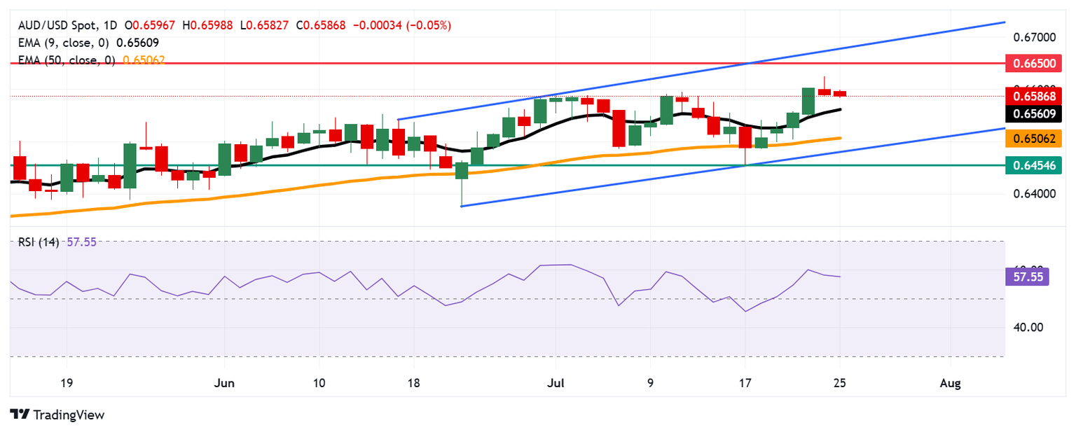 El AUD/USD está cotizando alrededor de 0.6590 el viernes. El análisis técnico del gráfico diario sugiere un sesgo alcista persistente a medida que el par se mueve hacia arriba dentro del patrón de canal ascendente. El Índice de Fuerza Relativa (RSI) de 14 días está posicionado por encima de la marca de 50, sugiriendo que un sesgo alcista está activo. Además, el par se mantiene por encima de la Media Móvil Exponencial (EMA) de nueve días, lo que indica que el impulso de precios a corto plazo sigue intacto.