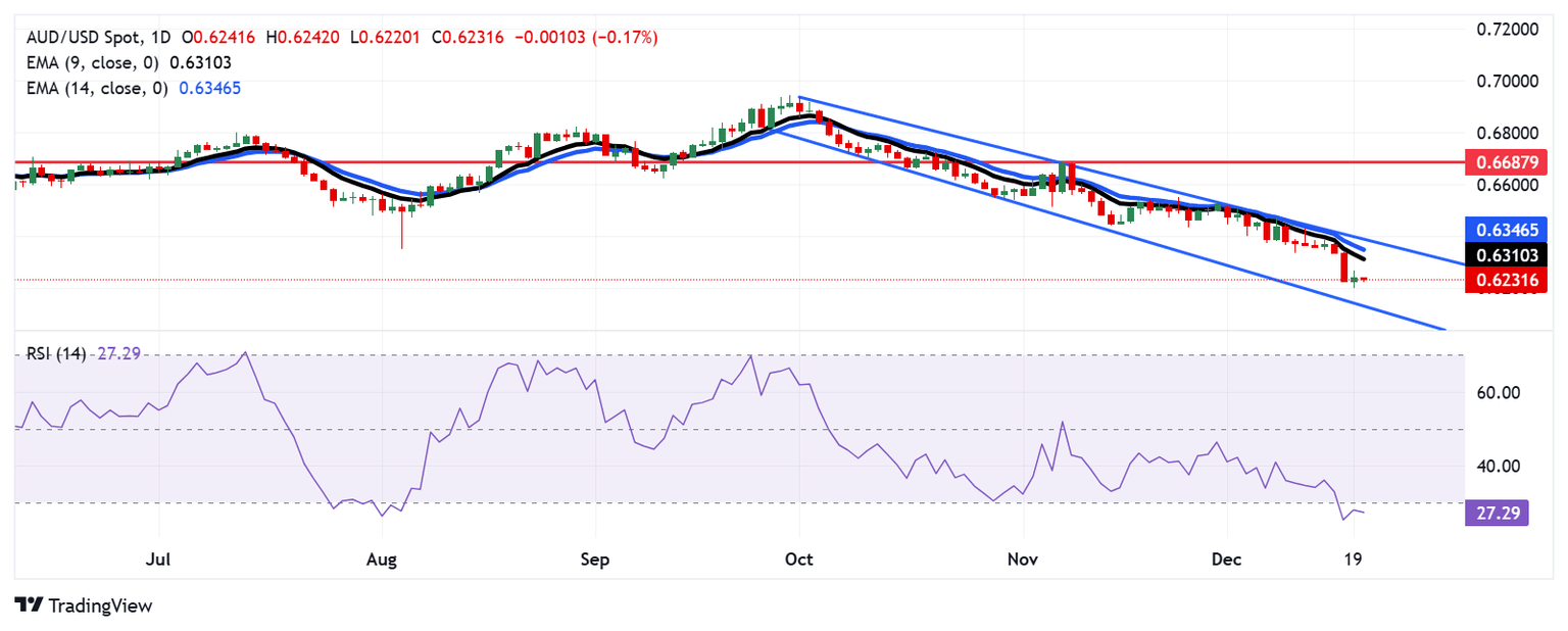 El AUD/USD cotiza cerca de 0.6230 el viernes, con el análisis del gráfico diario apuntando a un sesgo bajista persistente ya que el par continúa cayendo dentro de un patrón de canal descendente. Sin embargo, el Índice de Fuerza Relativa (RSI) de 14 días se mantiene por debajo de la marca de 30, señalando condiciones de sobreventa y sugiriendo la posibilidad de una corrección al alza en el corto plazo.