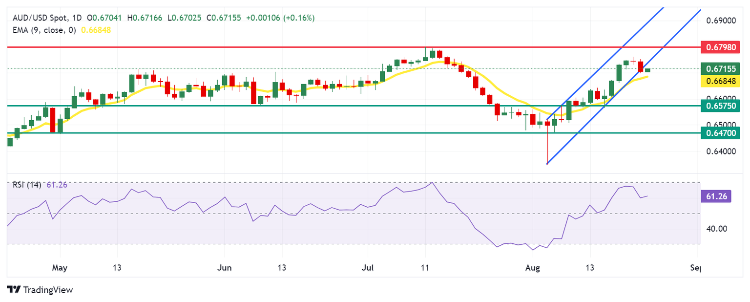El Dólar australiano cotiza alrededor de 0.6710 el viernes. El análisis del gráfico diario muestra que el par AUD/USD ha roto por debajo del canal ascendente, lo que sugiere un debilitamiento del sesgo alcista. Sin embargo, el Índice de Fuerza Relativa (RSI) de 14 días se mantiene por encima del nivel 50, apoyando el impulso alcista en curso.