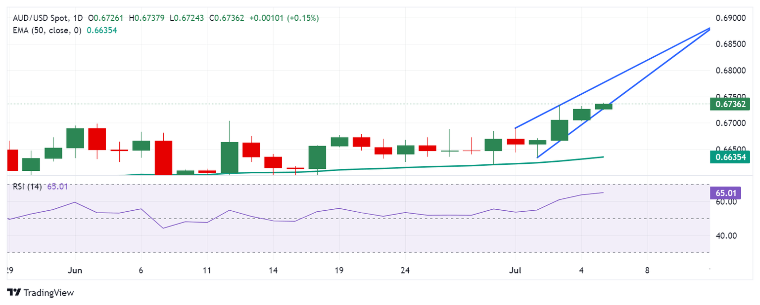 A la baja, el par AUD/USD prueba el límite inferior de la cuña ascendente en 0.6730, seguido por la media móvil exponencial (EMA) de 50 días en 0.6635.