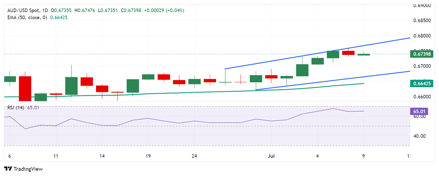 El Dólar australiano cotiza alrededor de 0.6740 el martes. El análisis del gráfico diario muestra que el par AUD/USD se consolida dentro de un canal ascendente, lo que indica un sesgo alcista. Además, el Índice de Fuerza Relativa (RSI) de 14 días se mantiene por encima del nivel 50, confirmando el impulso alcista.
