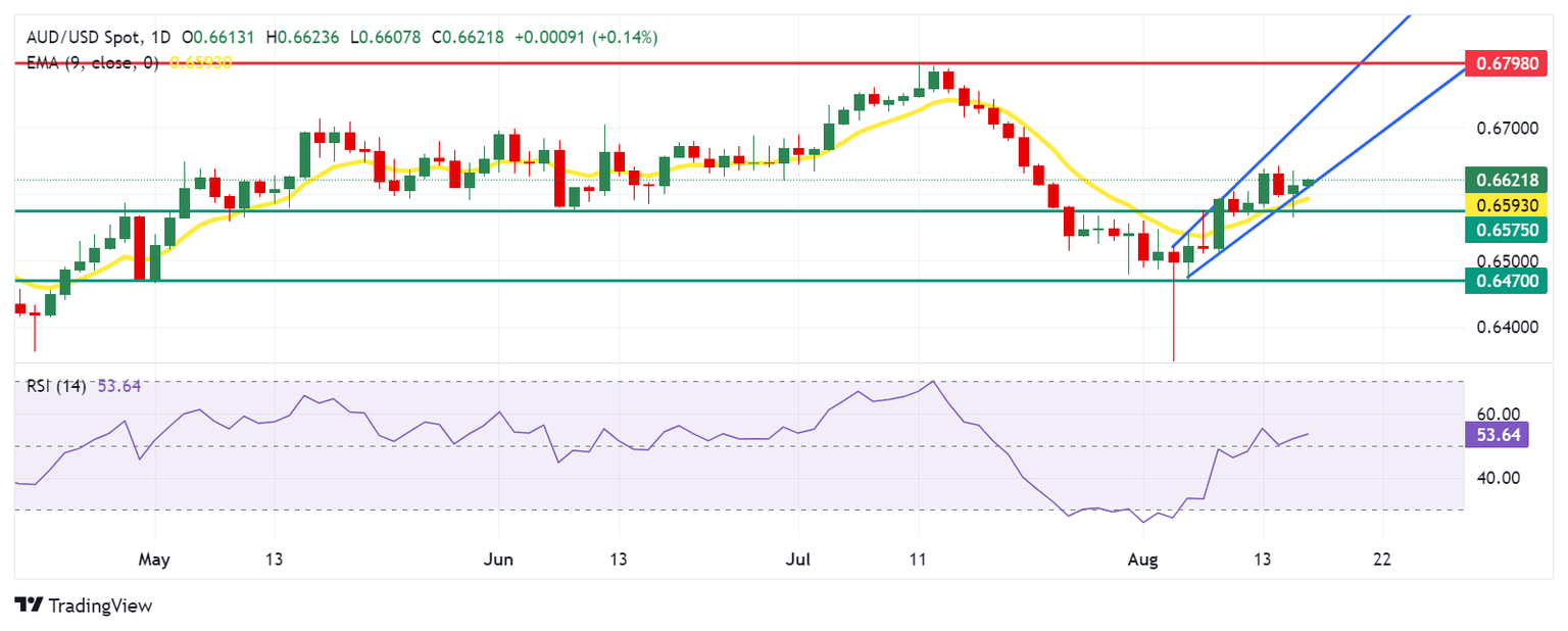 El Dólar australiano cotiza alrededor de 0.6620 el viernes. Según el análisis del gráfico diario, el par AUD/USD está probando el límite inferior de un canal ascendente. Una ruptura por debajo de este nivel podría indicar un debilitamiento de la tendencia alcista. Además, el Índice de Fuerza Relativa (RSI) de 14 días está ligeramente por encima de la marca de 50, apoyando el impulso alcista actual.