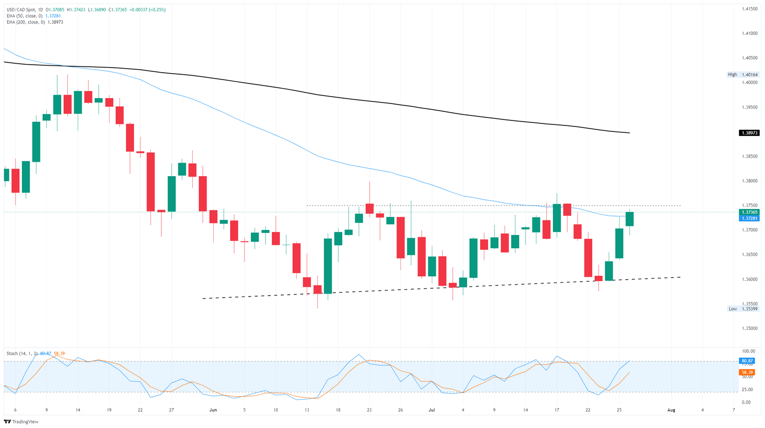 La acción del precio unilateral del lunes detrás del Dólar canadiense y el Dólar estadounidense envió el USD/CAD de regreso por encima del nivel de 1.3700. El par ahora está tomando un nuevo impulso hacia la media móvil exponencial (EMA) de 50 días cerca de 1.3740.