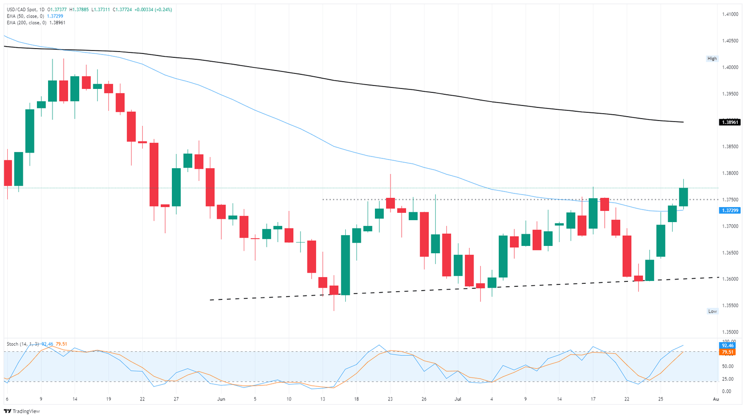 El USD/CAD continúa avanzando tras un desordenado patrón gráfico de triple fondo, subiendo de 1.3600 hacia la zona de 1.3800. El impulso alcista puede estar a punto de desacelerarse, con la acción del precio intradía luchando con el territorio gráfico al norte de la media móvil exponencial (EMA) de 50 días cerca de 1.3730.