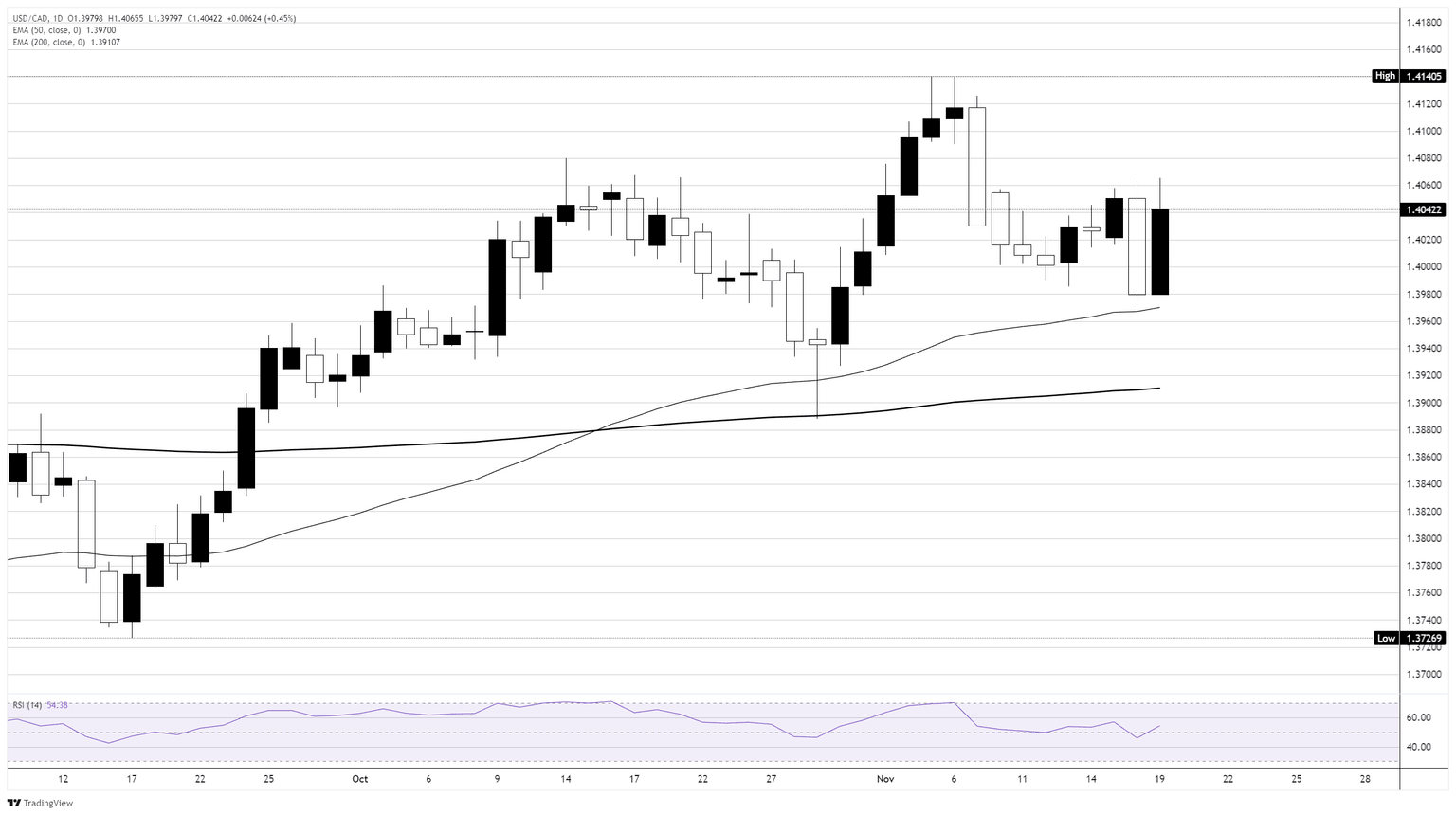 El momentum favorece ganancias continuas mientras las caídas se mantengan contenidas por encima de la EMA de 50 días en 1.3970. Un quiebre por debajo de ese umbral expondría la EMA de 200 días en 1.3911 y cambiaría el tono a corto plazo a consolidación. Por encima de la media a corto plazo, los toros buscarían extender el avance.