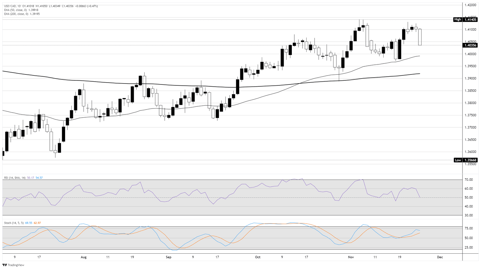 El USD/CAD enfrenta una nueva presión tras perder el control del nivel de 1.4100. El par se mantiene por encima de la media móvil exponencial (EMA) de 50 días en 1.3992 y la EMA de 200 días en 1.3920, manteniendo la inclinación general hacia arriba. La EMA de 50 días se sitúa por encima de la EMA de 200 días y ambas tienen una pendiente ascendente, confirmando el soporte de tendencia. El Índice de Fuerza Relativa (RSI) en 50.74 es neutral; un empuje sostenido por encima de 60.0 podría reforzar el impulso alcista.