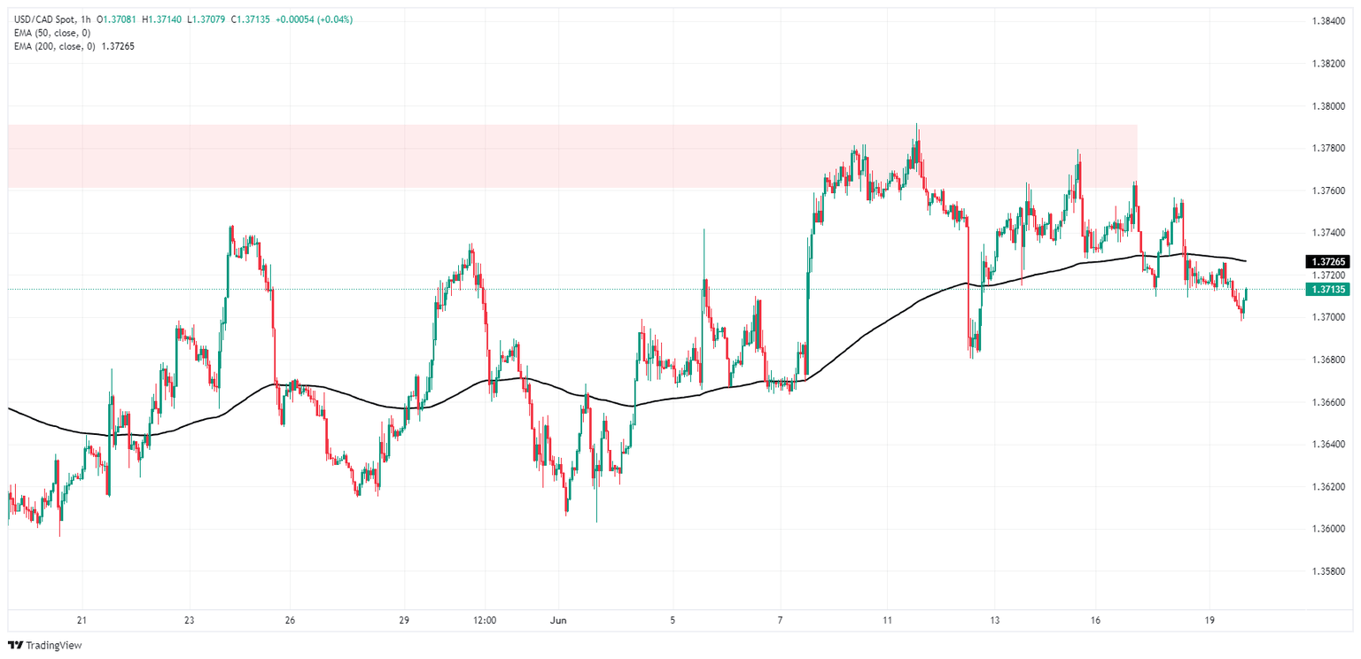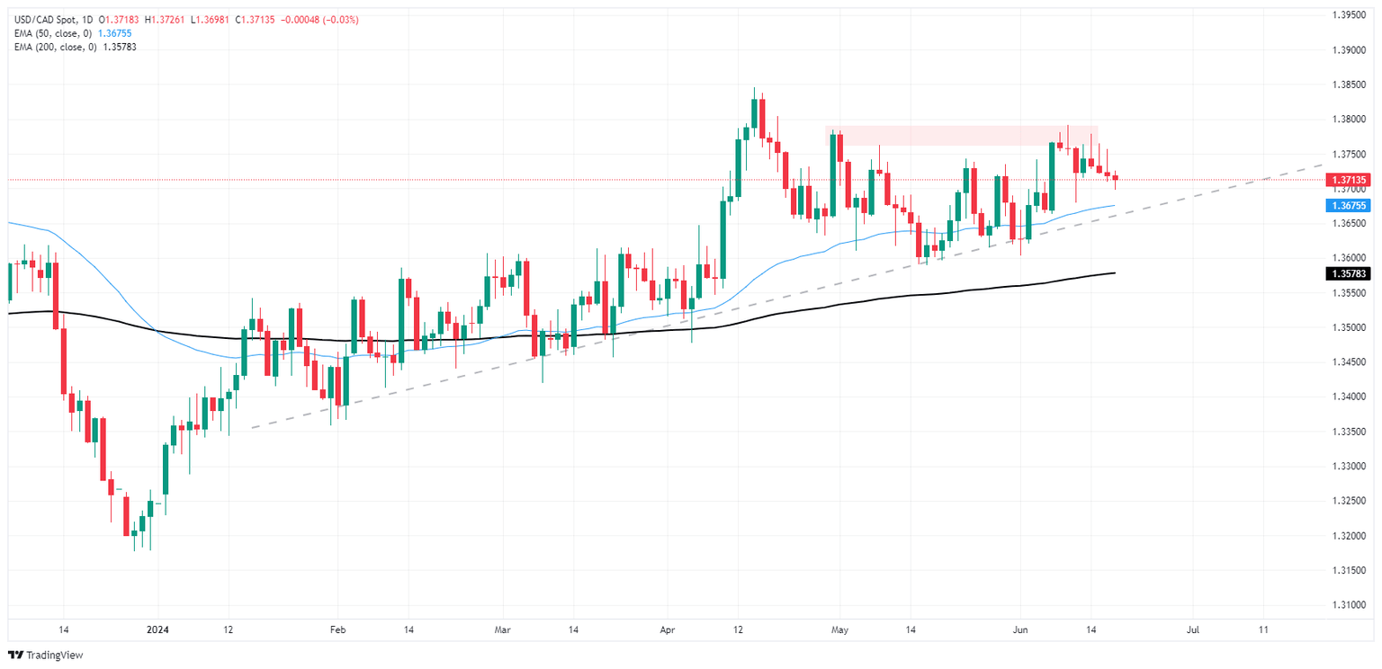 El Dólar canadiense (CAD) se negocia débilmente el miércoles, manteniéndose cerca de un nivel plano frente al Dólar y estancado dentro de un quinto de punto porcentual en las principales divisas. El par USD/CAD retrocedió hasta el nivel de 1.3700 antes de encontrar un piso en la sesión de mediados de semana, pero el par está operando en la parte baja de la mediana de las ofertas en la Media Móvil Exponencial (EMA) de 200 horas cerca de 1.3725.