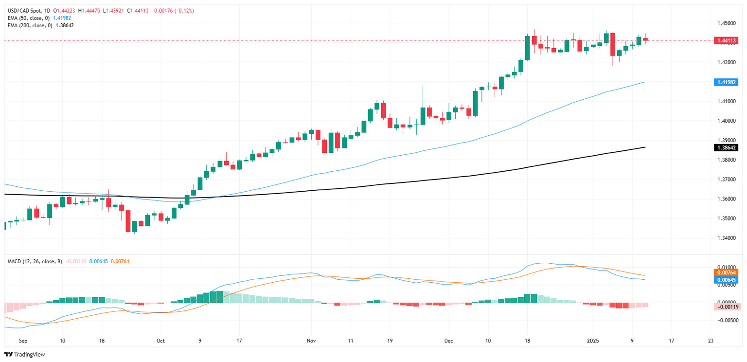 Mientras el Dólar canadiense se mantiene en el lado débil, el USD/CAD está chocando con máximos de varios años y oscilando en la zona de 1.4400. Los operadores del CAD siguen sin poder empujar al CAD hacia una recuperación técnica, pero las ganancias adicionales del Dólar parecen estar limitadas por los flujos más amplios del mercado.