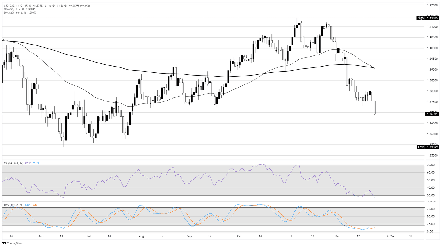 - El USD/CAD está profundamente sobrevendido, aumentando el riesgo de un retroceso o consolidación a corto plazo a pesar del impulso bajista.
