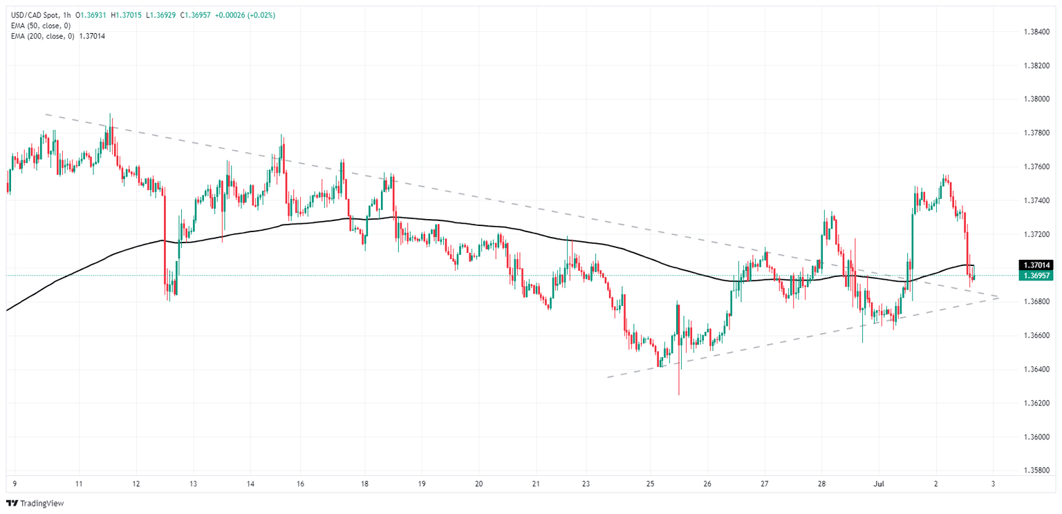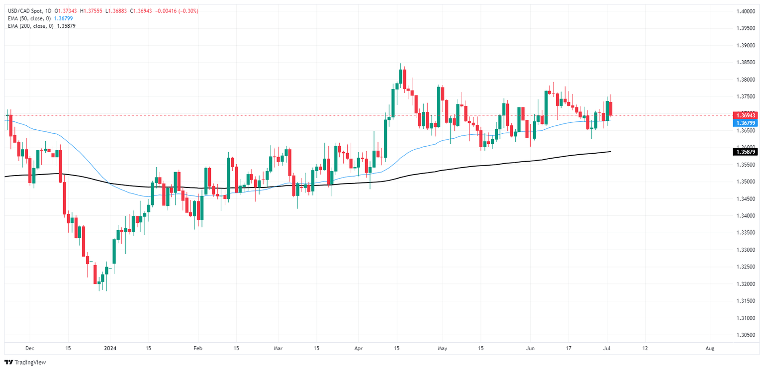 El USD/CAD ha caído por debajo de la zona de 1.3700 después de alcanzar un nuevo máximo a corto plazo alrededor de 1.3755 esta semana. La acción del precio intradía sigue siendo volátil, dejando mucho movimiento en el gráfico. Las velas japonesas diarias siguen colgadas en la media móvil exponencial (EMA) de 50 días en 1.3680. El USD/CAD continúa cotizando al norte de la EMA de 200 días en 1.3588, pero el impulso alcista no ha logrado registrar nuevas ganancias desde que alcanzó un pico justo por debajo de 1.3850 en abril.