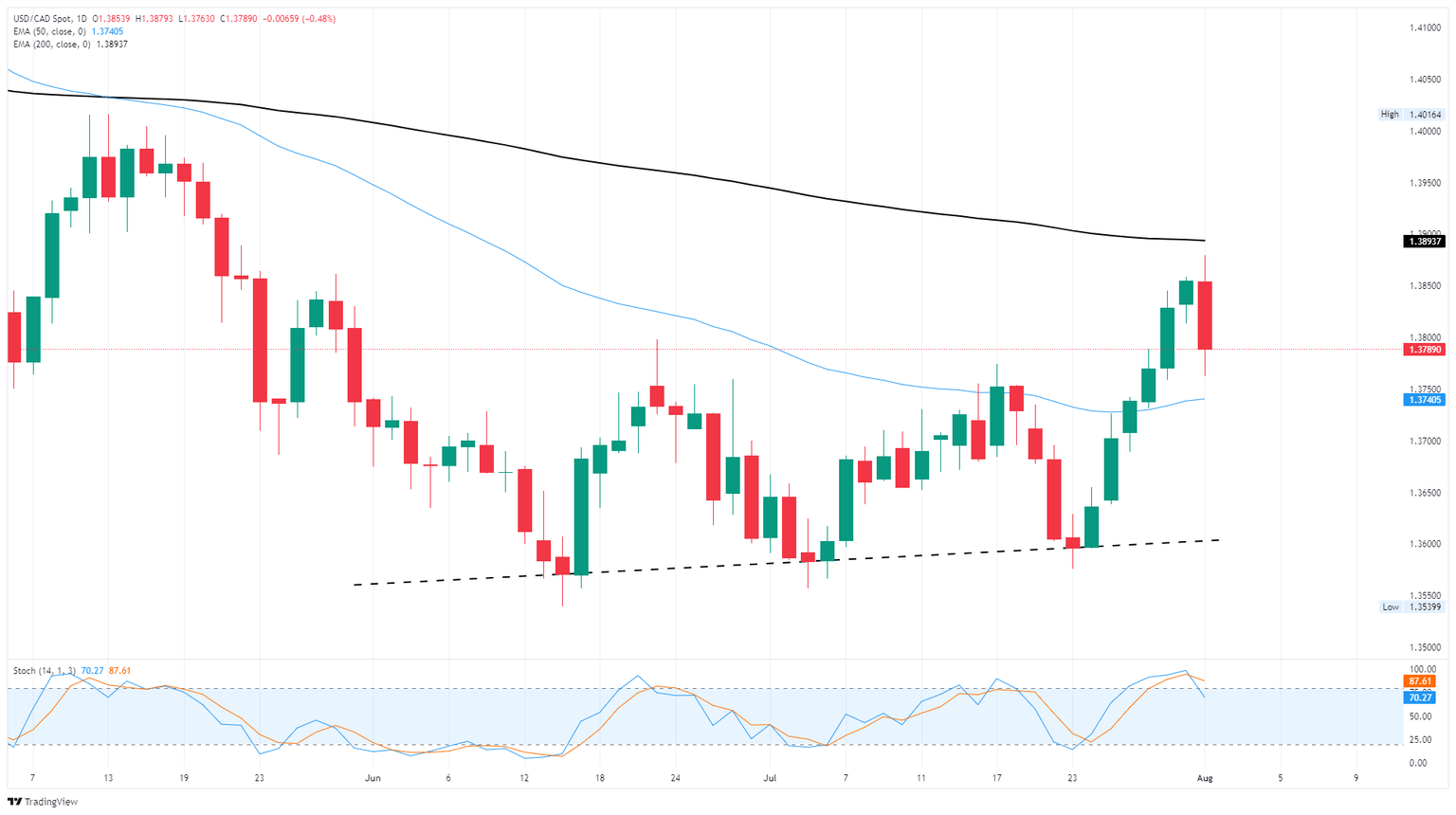 El par Dólar-Loonie está ahora limitado en tierra de nadie entre las Medias Móviles Exponenciales (EMA) de 200 días y 50 días, atrapado entre niveles técnicos clave entre 1.3900 y 1.3750.