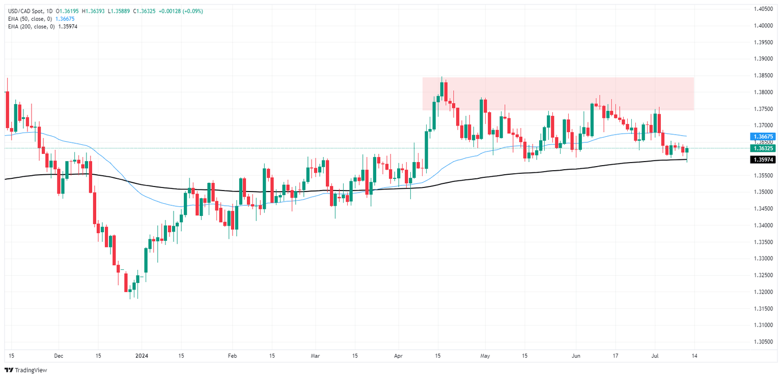 El USD/CAD comenzó la sesión de negociación estadounidense con una rápida caída a sus niveles más bajos desde mediados de abril, pero la firme presión de venta del CAD le dio un impulso al Dólar. El impulso corto no pudo mantener la presión, y el USD/CAD ha rebotado desde la media móvil exponencial (EMA) de 200 días cerca del nivel de 1.3600. A pesar del giro intradía, el par sigue atrapado en una congestión técnica que ha afectado a las velas diarias desde abril.