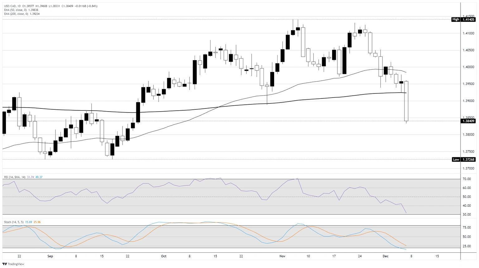 - La fortaleza del Dólar canadiense combinada con un Dólar estadounidense vacilante ha empujado al par USD/CAD de vuelta por debajo del nivel de 1.4000, y la acción del precio ahora está de nuevo en el lado bajista de la Media Móvil Exponencial (EMA) de 200 días cerca de 1.3925.
