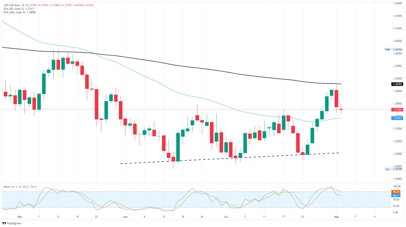 El Dólar canadiense (CAD) encontró un apoyo muy necesario el lunes, operando en un rango estable cerca de 1.3775 frente al Dólar estadounidense (USD). Los flujos globales del Dólar fueron golpeados bruscamente la semana pasada después de que los datos de Nóminas no Agrícolas (NFP) de EE.UU. mostraran revisiones a la baja significativas, lo que llevó al presidente de EE.UU. Donald Trump a despedir inmediatamente al jefe de la Oficina de Estadísticas Laborales (BLS).