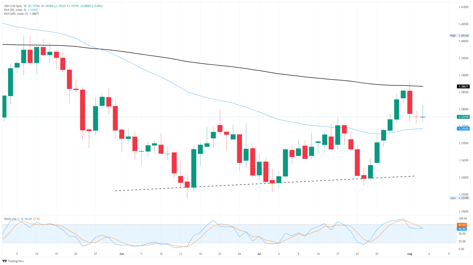 La agenda de datos canadienses está en gran medida vacía esta semana, dejando a los operadores del CAD en un aprieto mientras los titulares sobre comercio y aranceles dominan la situación. Se espera que los datos laborales canadienses se publiquen el viernes, y se anticipa que mostrarán mucho de lo mismo que los últimos números de empleo neto de EE.UU. También se esperan los PMI de Ivey de Canadá para julio el jueves, pero es poco probable que muevan mucho el sentimiento.