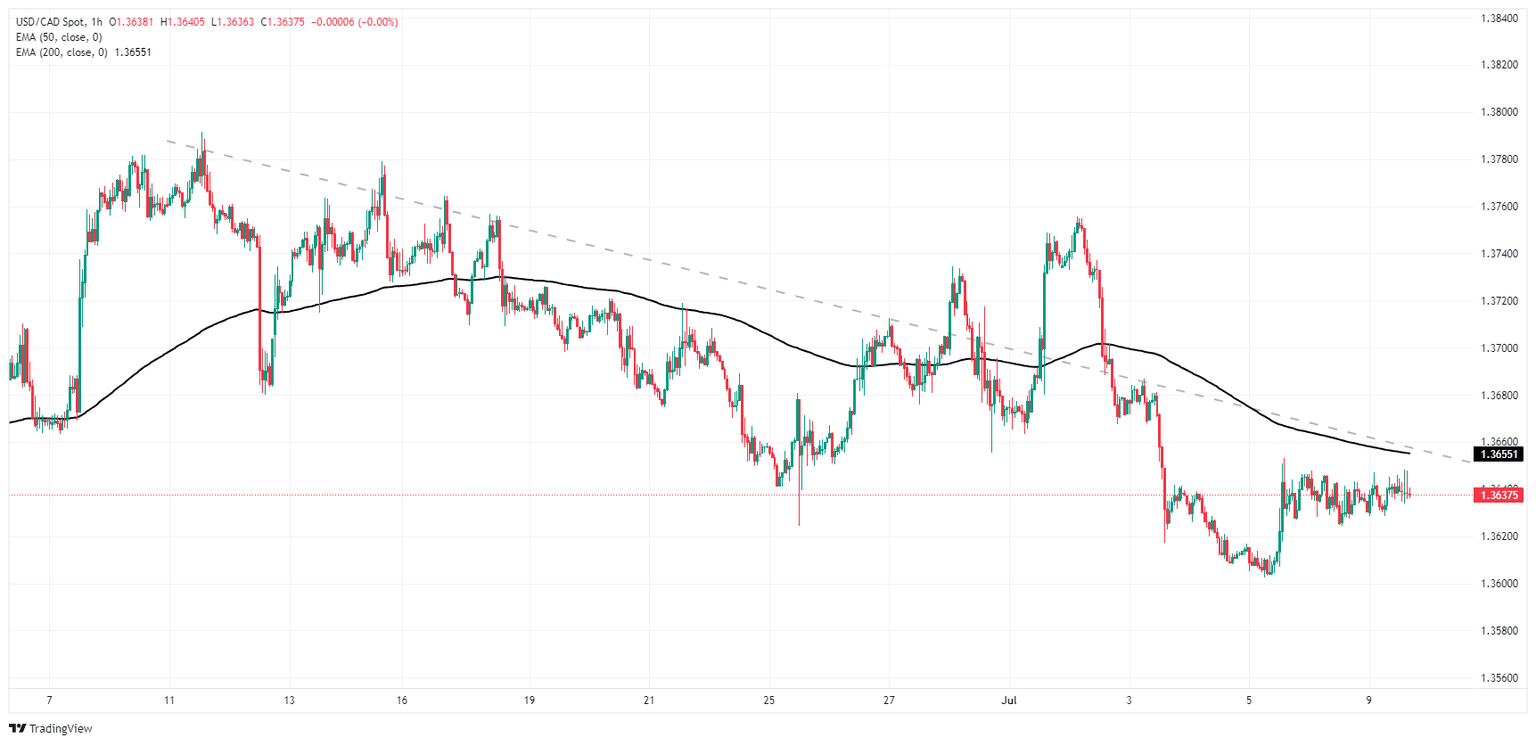 El USD/CAD está estancado cerca de 1.3640, manteniéndose a flote y moviéndose en un rango ajustado ya que el par sigue sin poder romper por encima de 1.3650. El rebote de la semana pasada desde el último mínimo en 1.3600 no logró empujar al par por encima de la media móvil exponencial (EMA) de 200 horas en 1.2656, pero la presión de compra sigue siendo demasiado alta para permitir una caída a nuevos mínimos.