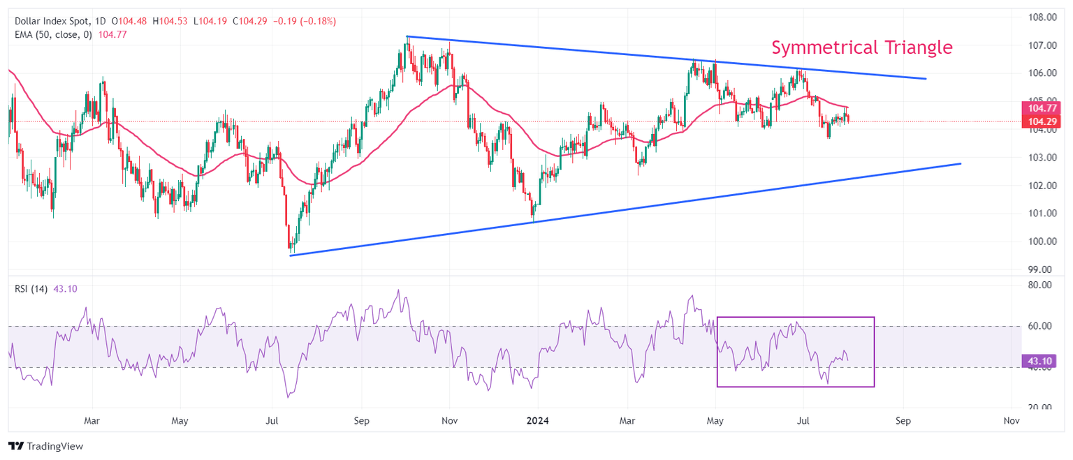 El Índice del Dólar cotiza en una formación de triángulo simétrico, en un marco de tiempo diario, que exhibe una fuerte contracción de la volatilidad. El patrón de gráfico mencionado resulta en una tendencia lateral con menor volumen y ticks más pequeños. La tendencia a corto plazo sigue siendo bajista ya que la media móvil exponencial (EMA) de 50 días alrededor de 104.77 actúa como una barrera importante para los alcistas del Dólar estadounidense.