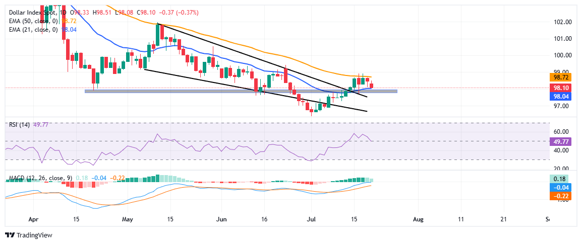 - El Índice del Dólar estadounidense DXY está volviendo a probar una zona de soporte crítica cerca de 98.80-98.00, mostrando signos de un impulso que se desvanece.