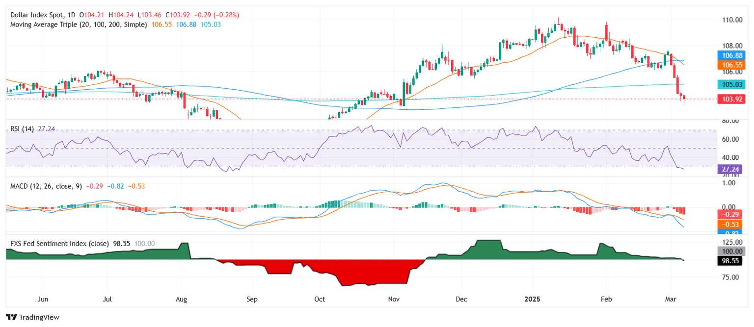 El Índice del Dólar estadounidense (DXY) está atrapado en una profunda venta, habiendo caído por debajo de 104.00 y revisitando sus niveles más bajos desde noviembre de 2024. Las medias móviles simples (SMA) de 20 y 100 días han confirmado un cruce bajista, reforzando el impulso negativo. El Índice de Fuerza Relativa (RSI) señala condiciones de sobreventa, sugiriendo un posible rebote a corto plazo, pero el MACD permanece firmemente en territorio bajista, apuntando a un riesgo de caída continua. Si el DXY no logra recuperar 104.50, el siguiente nivel clave de soporte se encuentra en 103.50, lo que podría determinar si la venta se extiende aún más.