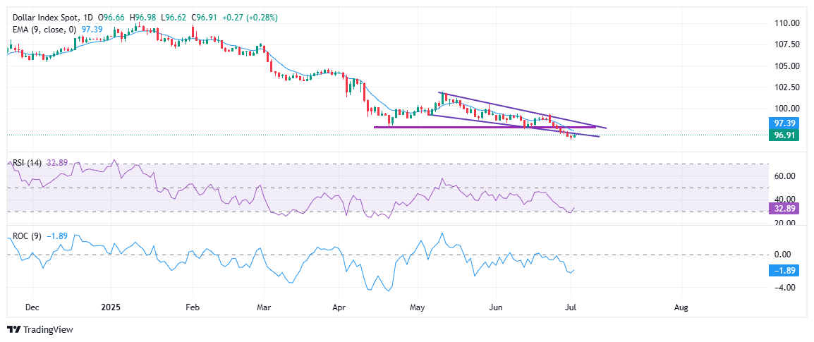 Aunque el rebote parece alentador, el precio sigue limitado por debajo de la media móvil exponencial (EMA) de 9 días, actualmente en alrededor de 97.39. La acción del precio recientemente rompió ligeramente por debajo del límite inferior de un patrón de cuña descendente, una estructura a menudo asociada con señales de reversión alcista.