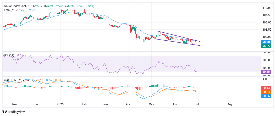 El Índice del Dólar estadounidense (DXY) continúa operando bajo una presión bajista sostenida, rompiendo recientemente por debajo del límite inferior de un patrón de cuña descendente que ha guiado la acción del precio desde mediados de mayo. El índice ahora ronda 96.85 y está volviendo a probar el límite inferior de la cuña después de rebotar desde el mínimo intradía de 96.38, aunque sigue muy por debajo de la media móvil exponencial (EMA) de 21 días, actualmente en 98.20. Este rechazo constante de la EMA destaca la fuerza de la tendencia bajista prevaleciente. La ruptura de la cuña sugiere una posible aceleración en la presión bajista, sin señales inmediatas de una reversión.