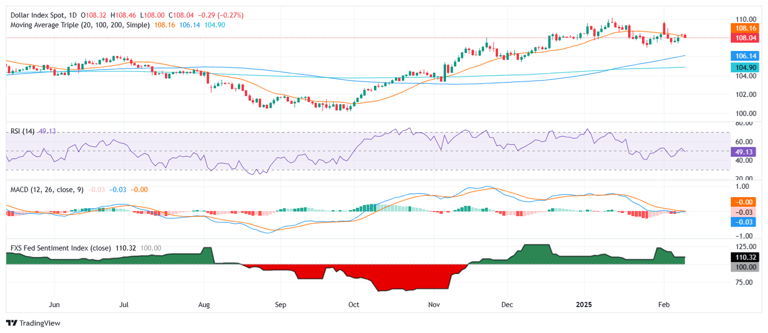 El Índice del Dólar estadounidense lucha por mantener el impulso, deslizándose por debajo de la media móvil simple (SMA) de 20 días alrededor de 108.50. El Índice de Fuerza Relativa (RSI) está descendiendo, acercándose al territorio bajista por debajo de 50, señalando un impulso decreciente. El histograma de la Convergencia/Divergencia de Medias Móviles (MACD) se está volviendo negativo, indicando una creciente tracción bajista.