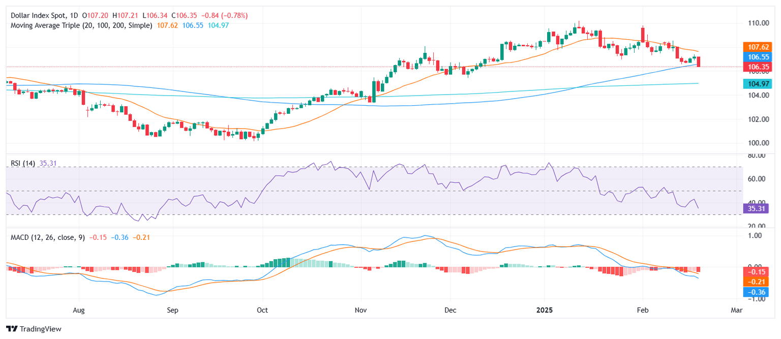 El Índice del Dólar de EE.UU. permanece bajo presión después de caer por debajo de 106.50, con un impulso bajista ganando tracción. El índice lucha por recuperar la media móvil simple (SMA) de 20 días, señalando una debilidad continua. Tanto el Índice de Fuerza Relativa (RSI) como el MACD permanecen arraigados en territorio negativo, sugiriendo una presión a la baja persistente. Una caída decisiva por debajo de la SMA de 100 días en 106.30 podría señalar una nueva ruptura bajista, con 106.00 emergiendo como el siguiente nivel de soporte significativo. Los alcistas necesitan recuperar la zona de resistencia de 107.50 para cambiar el impulso a su favor.