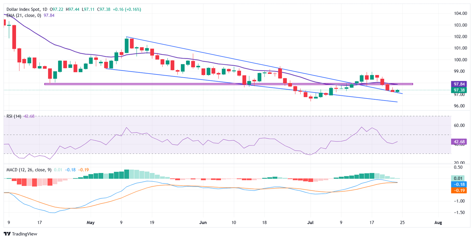 El Índice del Dólar estadounidense (DXY) está mostrando signos de estabilización el jueves después de extender su reciente caída desde cerca de máximos de cuatro semanas, con el índice rondando el nivel de 97.38. La acción del precio se ha desacelerado después de romper por debajo de un soporte clave, ahora convertido en resistencia, cerca de 97.80-98.00, que se alinea estrechamente con la media móvil exponencial (EMA) de 21 días. El retroceso se mantiene contenido por encima del nivel psicológico de 97.00, donde el índice ha encontrado algo de soporte intradía. Este nivel también coincide con el límite superior de un patrón de cuña descendente que fue decisivamente roto al alza la semana pasada. Esta área ahora está sirviendo como una zona de prueba y podría ofrecer un soporte a corto plazo mientras los operadores reevalúan la tendencia más amplia.