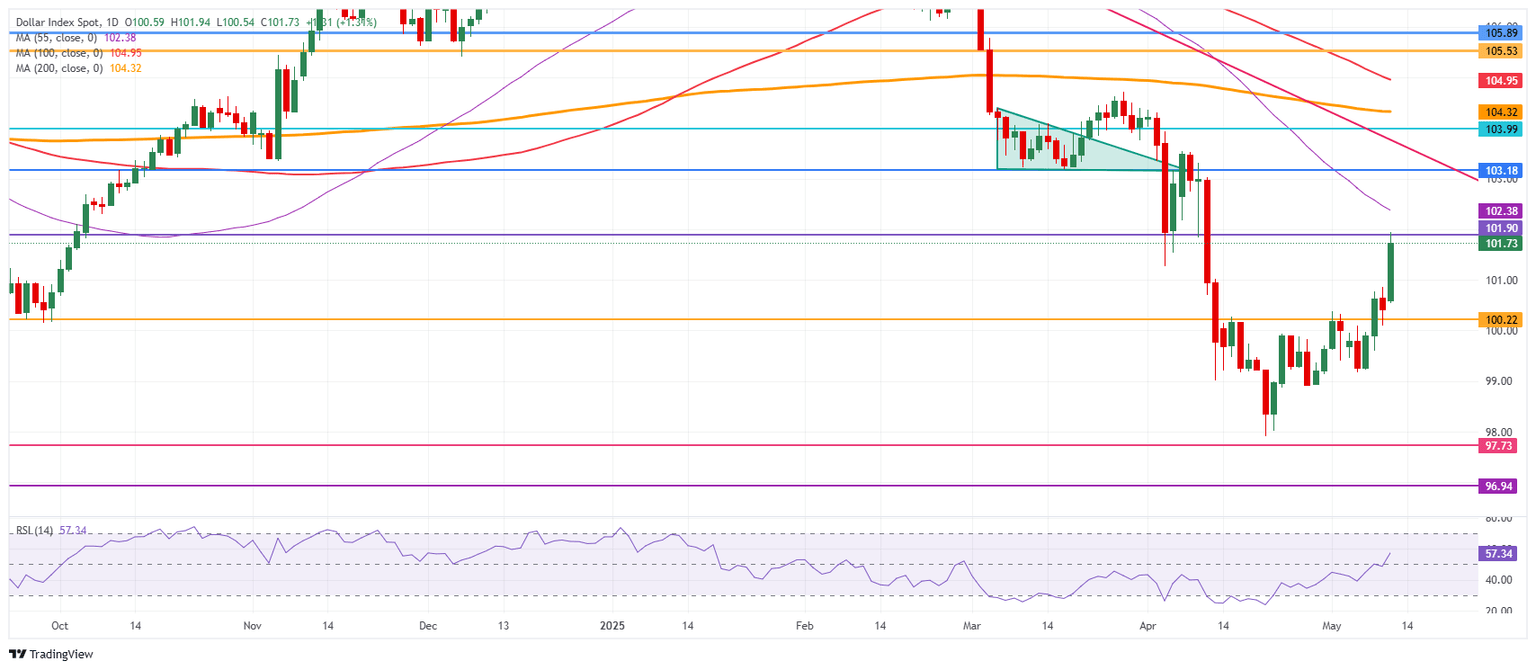 El Índice del Dólar estadounidense (DXY), que rastrea el desempeño del Dólar estadounidense (USD) frente a seis monedas principales, supera una recuperación de más del 1% el lunes después de que China y los Estados Unidos (EE.UU.) acordaran una pausa de 90 días en su guerra comercial al reducir los aranceles de ambos lados. Tras un fin de semana de discusiones, el Secretario del Tesoro de EE.UU., Scott Bessent, anunció la desescalada de la guerra comercial entre las dos naciones: China reducirá sus aranceles sobre los productos estadounidenses al 10% desde el 125% original, mientras que EE.UU. lo hará al 30% (desde el 145%) sobre los productos chinos, ambos durante 90 días, informa Bloomberg. La noticia llevó al Dólar estadounidense a su nivel más alto en un mes.