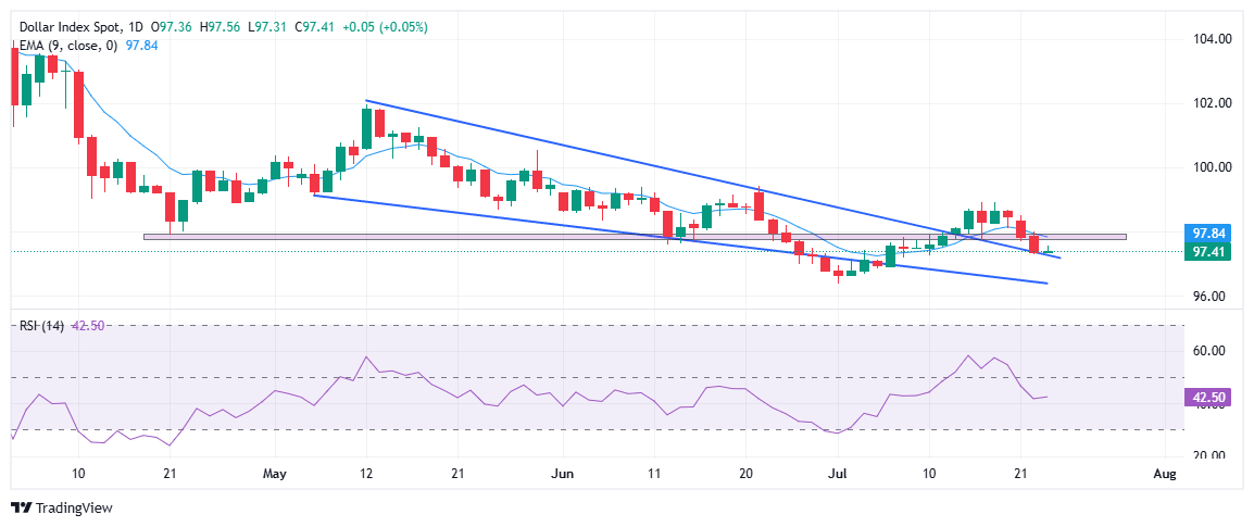 El Índice del Dólar estadounidense (DXY) se está negociando alrededor de 97.20 tras un fuerte retroceso desde sus recientes máximos. El precio está actualmente flotando justo por debajo del límite superior de un patrón de cuña descendente, que había sido previamente superado al alza pero ahora está siendo puesto a prueba nuevamente como un posible soporte convertido en resistencia. Este tipo de prueba de cuña suele ser crucial. Si los alcistas no logran recuperar la estructura rota con convicción, podría señalar un falso breakout y cambiar el tono técnico de nuevo a bajista. La media móvil exponencial (EMA) de 9 días, que ahora tiende ligeramente por encima en 97.84, añade presión limitando el potencial alcista.