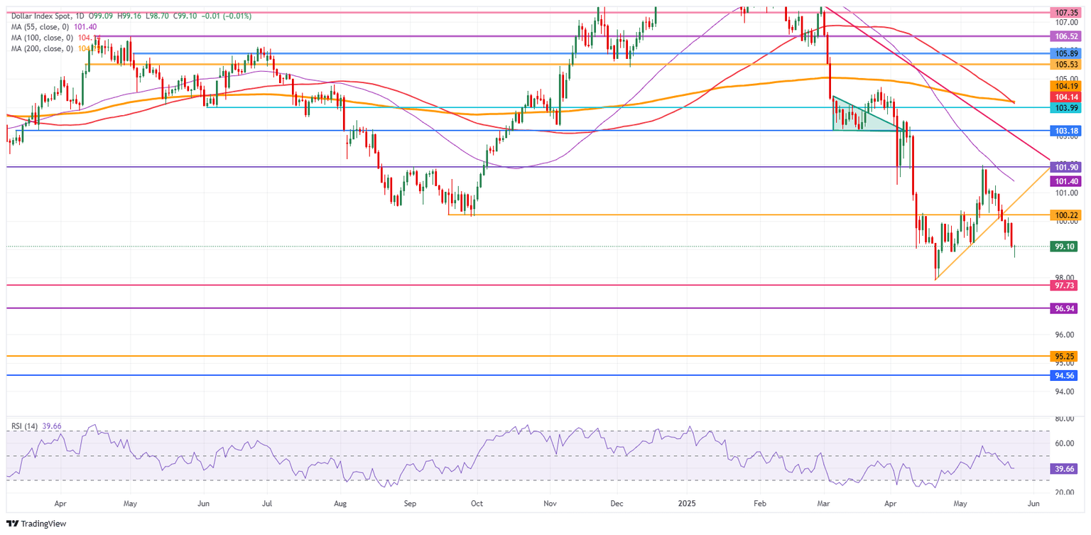 El Índice del Dólar estadounidense (DXY), que rastrea el rendimiento del valor del Dólar frente a seis divisas principales, está cotizando muy cerca de donde abrió, cerca de 99.09 al sonar la campana de cierre europeo. La caída en el Dólar se produjo después de que el presidente de Estados Unidos (EE.UU.), Donald Trump, acordara extender la fecha límite de los aranceles del 50% sobre la UE hasta el 9 de julio, en lugar del 1 de junio, cuando se suponía que entrarían en vigor. En general, un suspiro de alivio recorre los mercados, con los activos de riesgo emergiendo como los mayores ganadores en estos desarrollos al inicio de la semana.