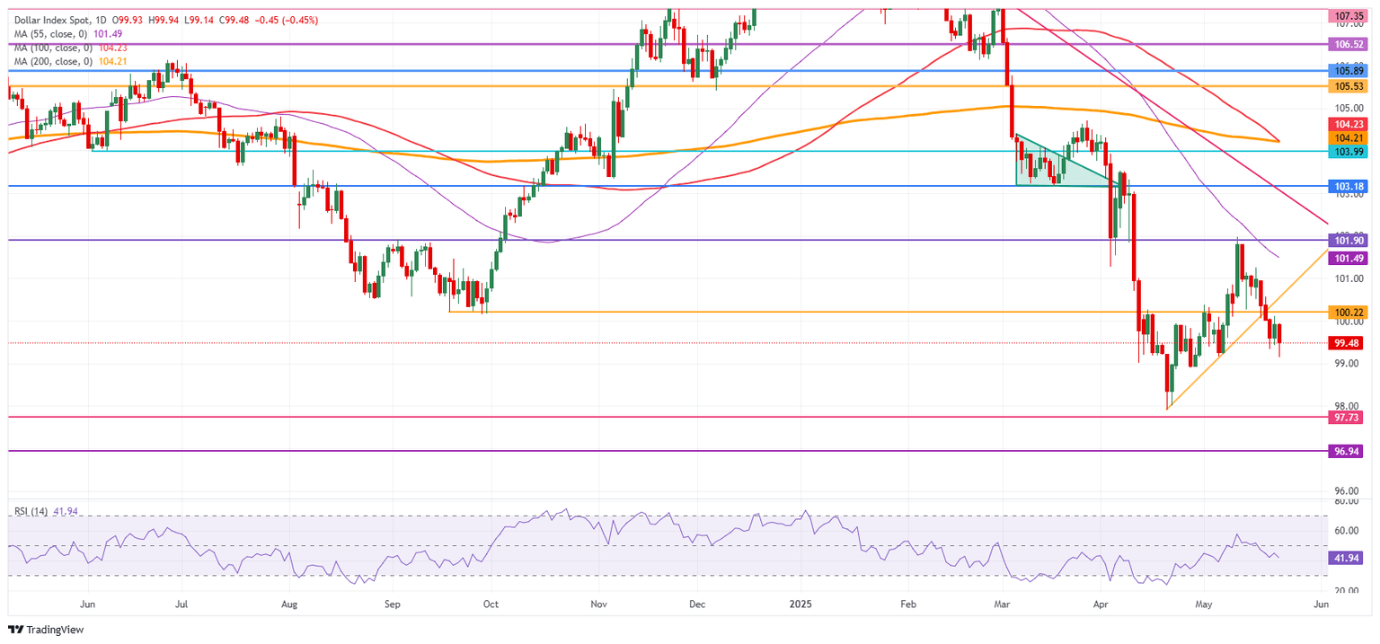 El Índice del Dólar estadounidense está de vuelta a la casilla de salida, coqueteando con un nuevo mínimo de dos semanas al momento de escribir cerca de 99.40. Con el proyecto de ley de gastos ahora habiendo superado ese primer obstáculo, el riesgo de un efecto de choque sustancial en la deuda de EE.UU. podría materializarse aún más. Incluso otro recorte en su calificación crediticia podría estar bajo consideración, dañando aún más la imagen de EE.UU. y al Dólar estadounidense.