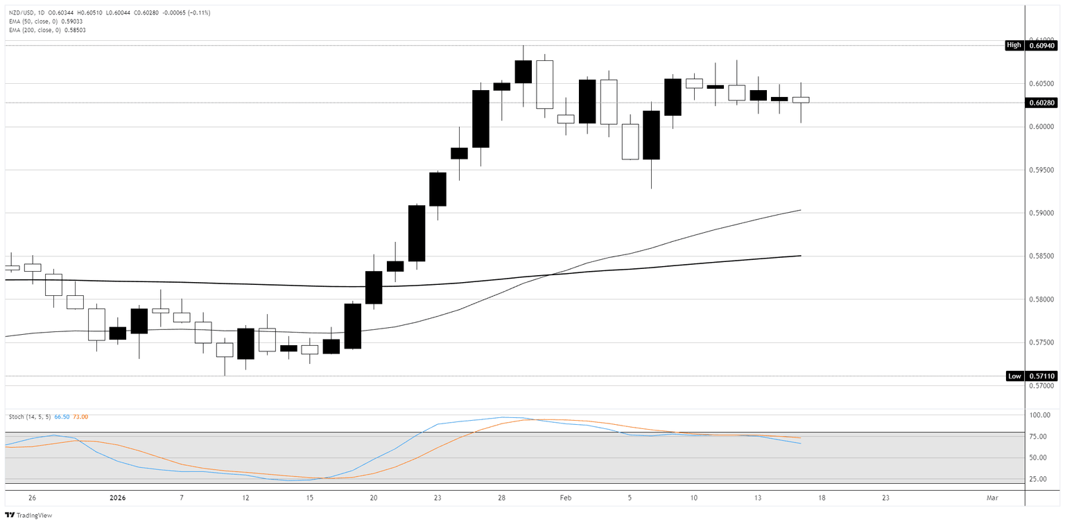 En el gráfico diario, el NZD/USD se cotiza cerca de 0.6037 el martes después de consolidarse en un rango estrecho por debajo del máximo del 10 de febrero de 0.6065. La estructura de tendencia más amplia es alcista, con el precio manteniéndose bien por encima de la SMA de 50 días en 0.6047 y la EMA de 200 días en 0.6029, ambas en tendencia ascendente y convergiendo para proporcionar un clúster de soporte dinámico alrededor de la zona de 0.6030 a 0.6050. El Índice de Fuerza Relativa (RSI) de 14 días lee 62, confirmando un impulso positivo sin condiciones extendidas, mientras que el histograma del MACD se mantiene por encima de cero.