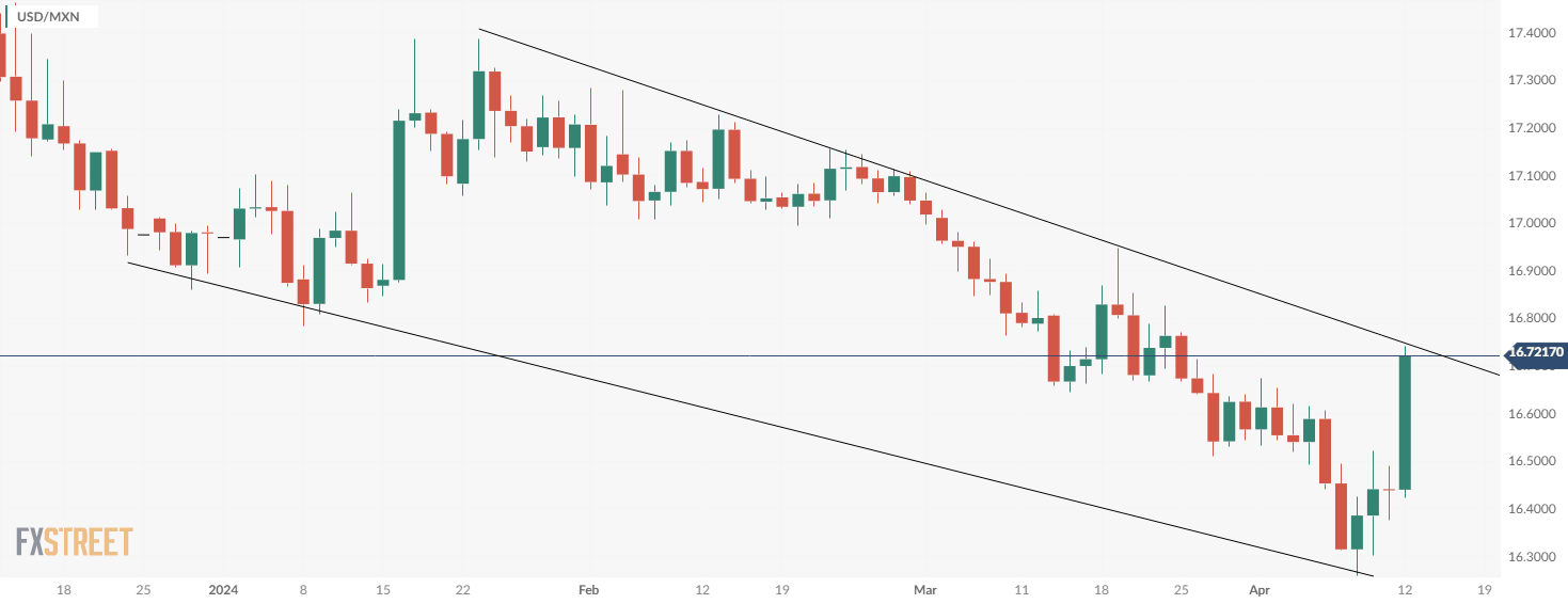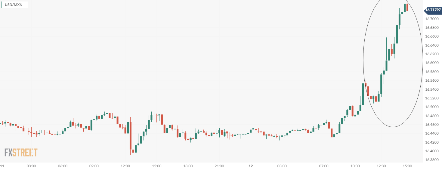 El USD/MXN ha protagonizado un fuerte rally en la jornada del viernes, disparándose desde un mínimo diario de 17.42 a un máximo de dos semanas y media en 17.74. Al momento de escribir, el Dólar cotiza frente al Peso mexicano sobre 16.71, ganando un impresionante 1.70% diario.