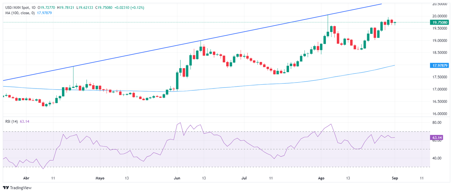 El USD/MXN ha abierto la primera semana de septiembre oscilando entre el mínimo diario ya probado el pasado viernes en 19.62 y un máximo del día de 19.78. Al momento de escribir, el par cotiza alrededor de 19.75, ganando un 0.12% en el día